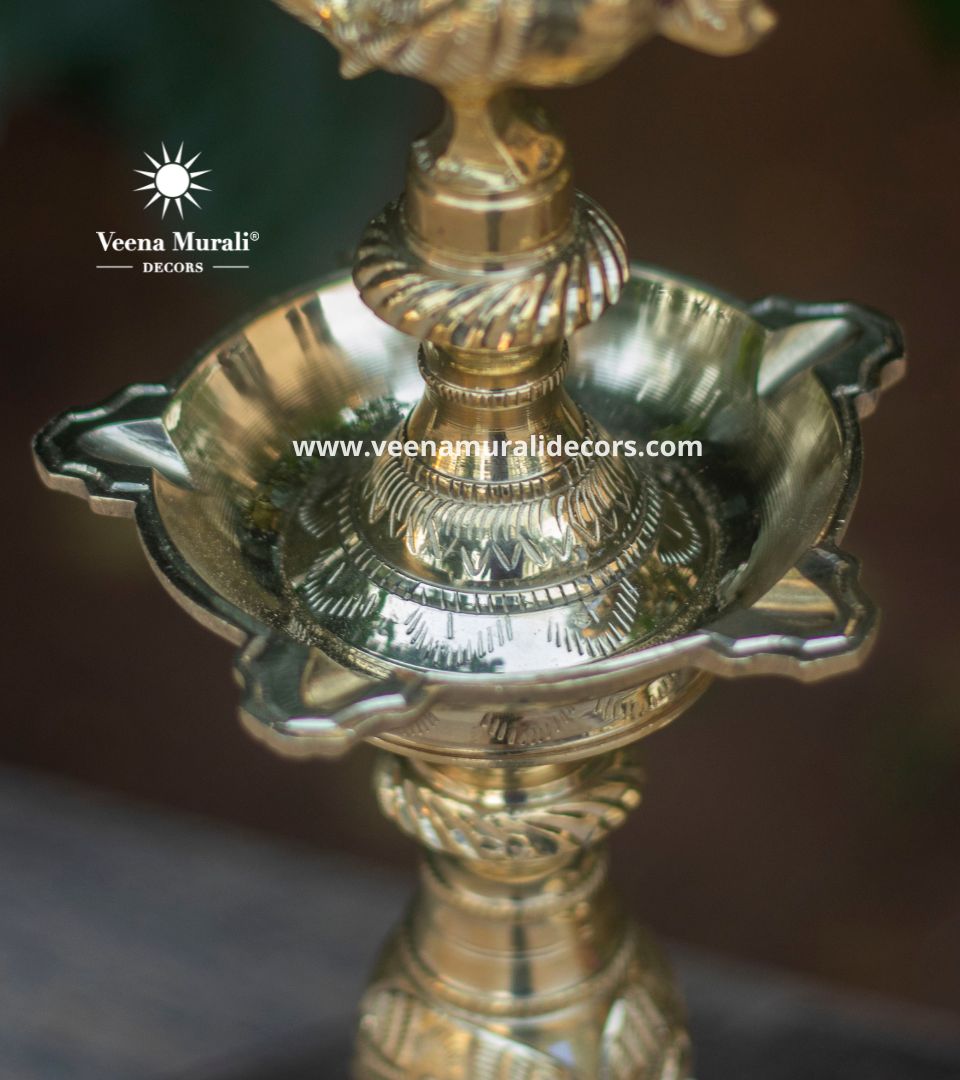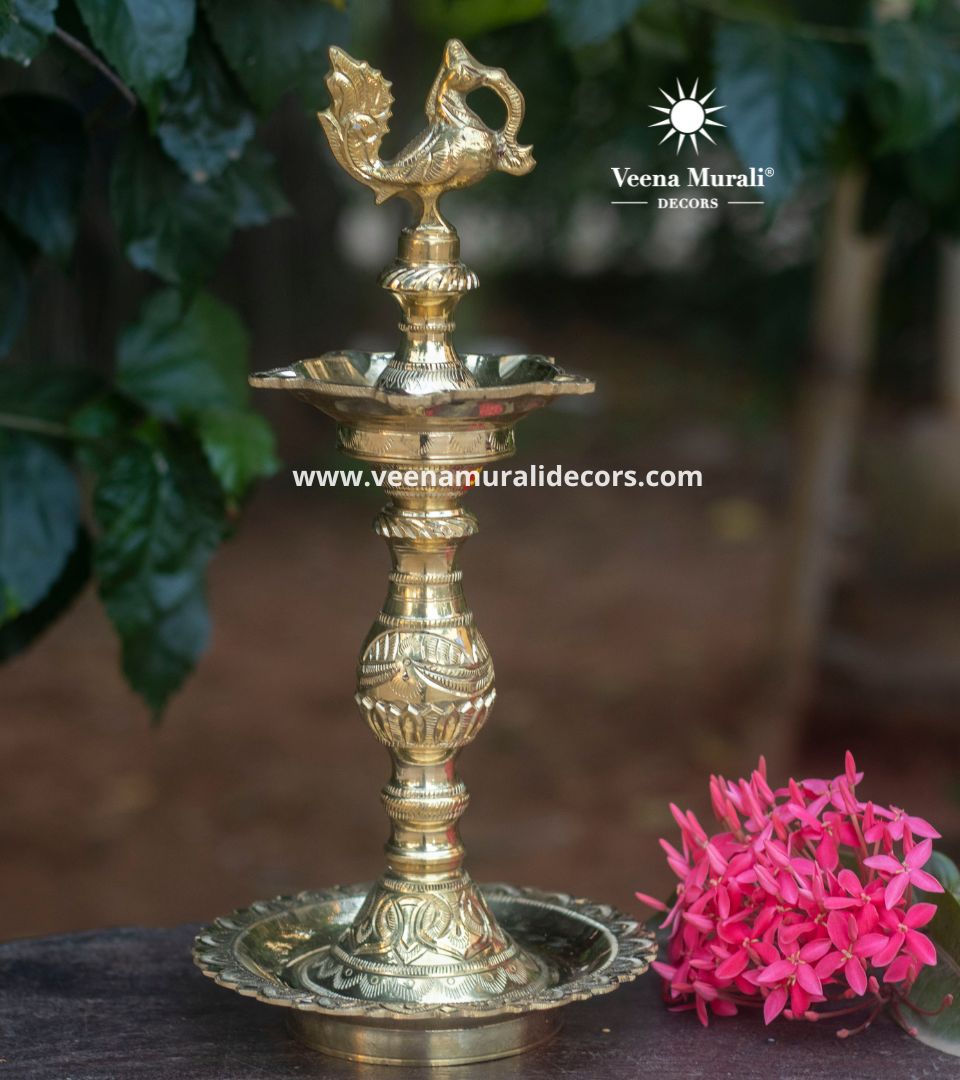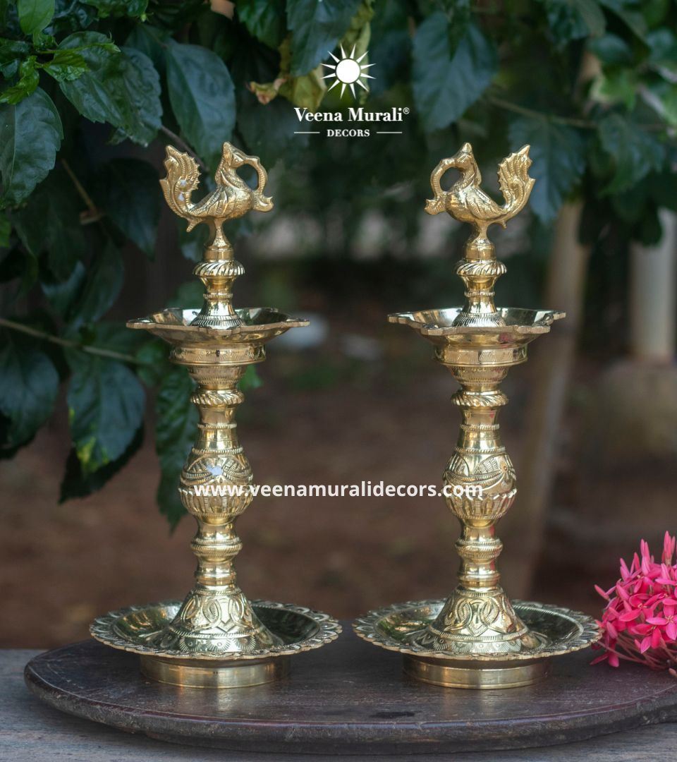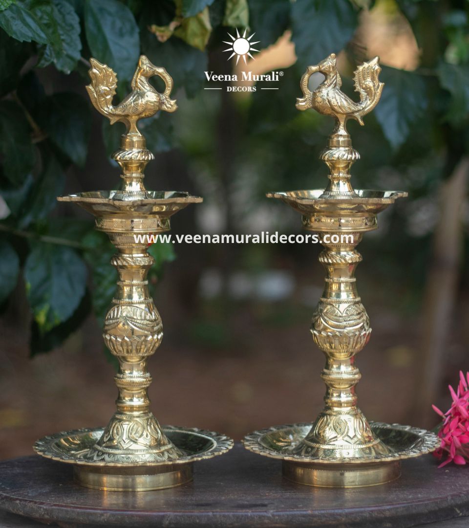 A 14-inch pair of Nachiyar Koil Base Design Lamps, finely crafted in brass. Featuring the iconic temple style base, these lamps represent purity, prosperity, and traditional South Indian craftsmanship. Perfect for pooja or decor.