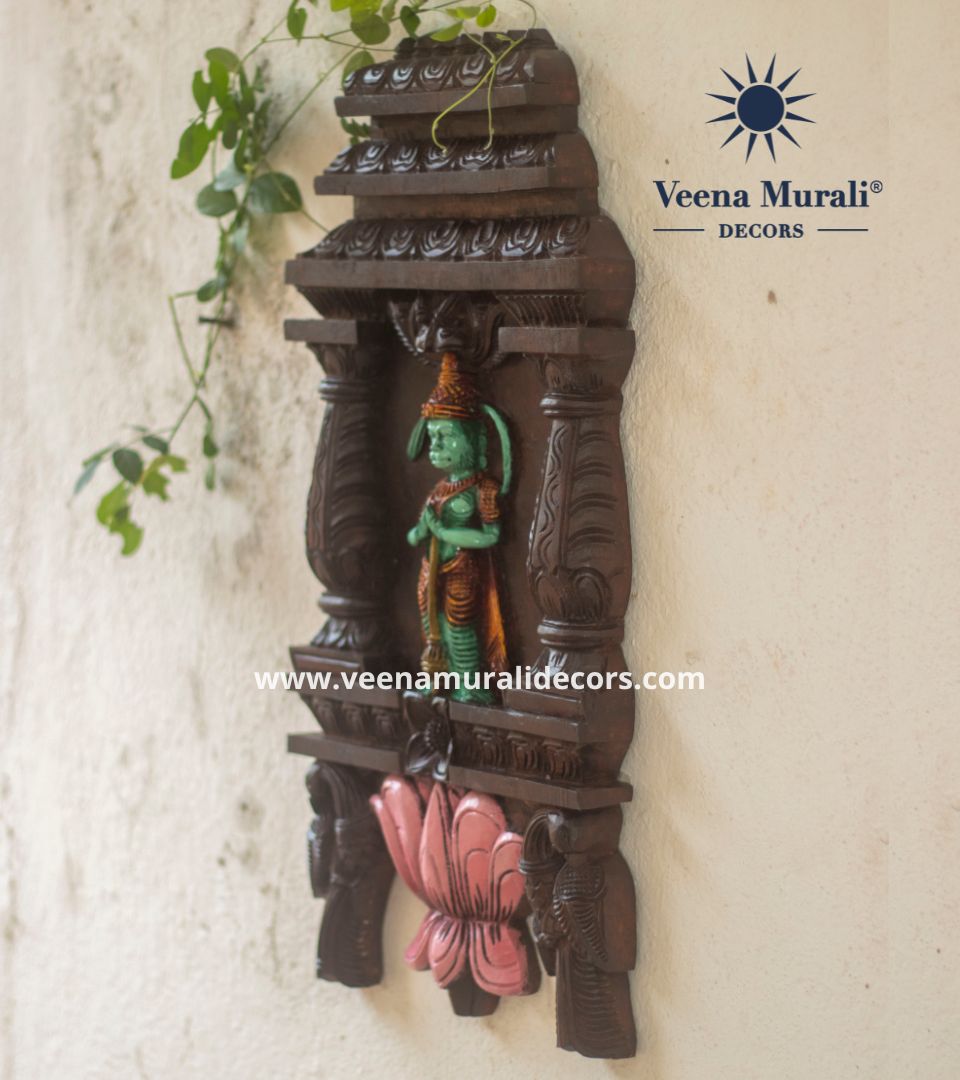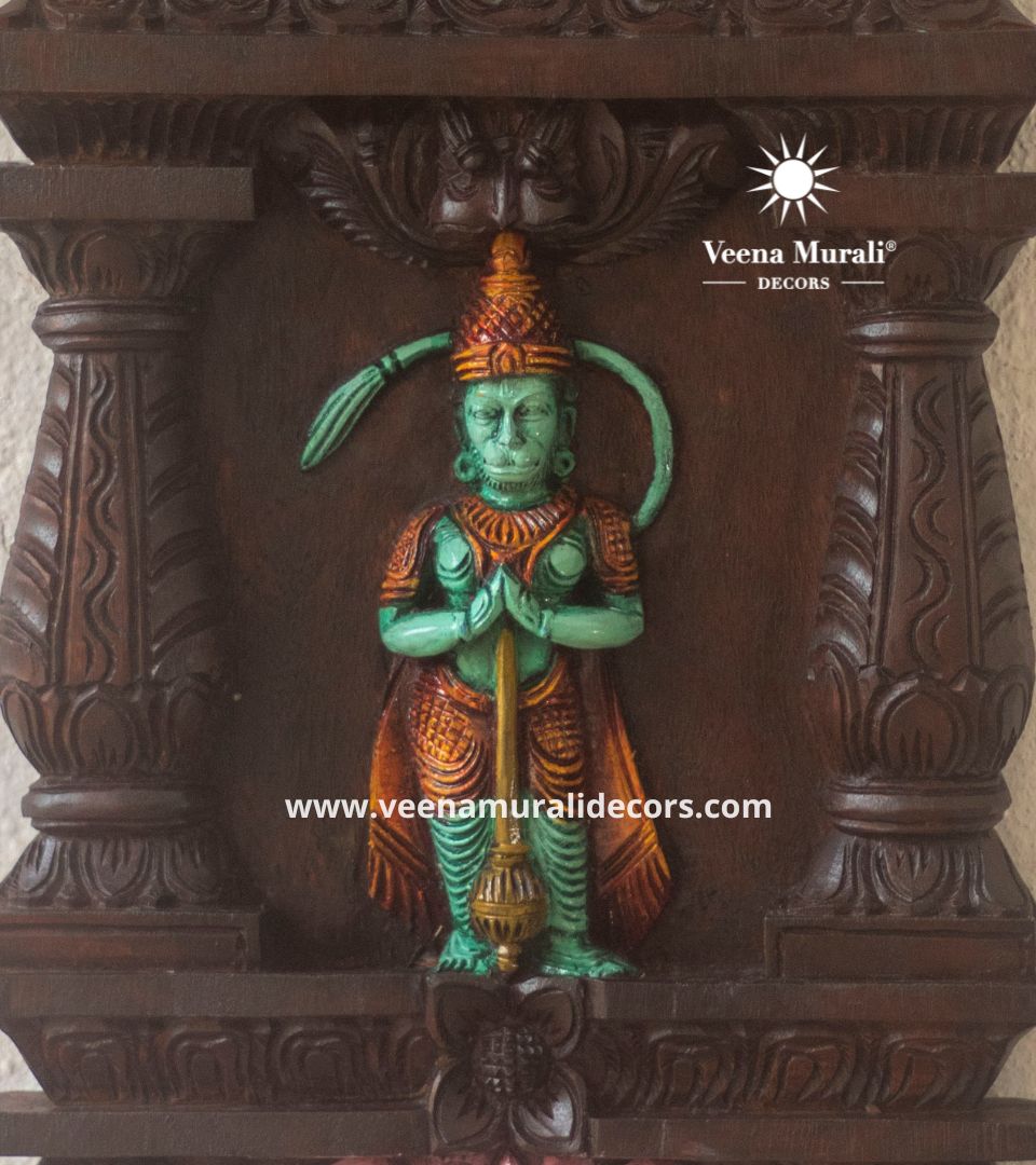 Hand-carved 2 foot Veera Hanuman Kavadi in wood, radiating power, devotion, and South Indian artistry ideal for homes, temples, or spiritual spaces.
