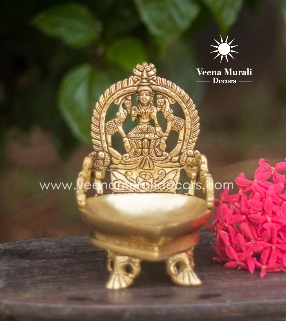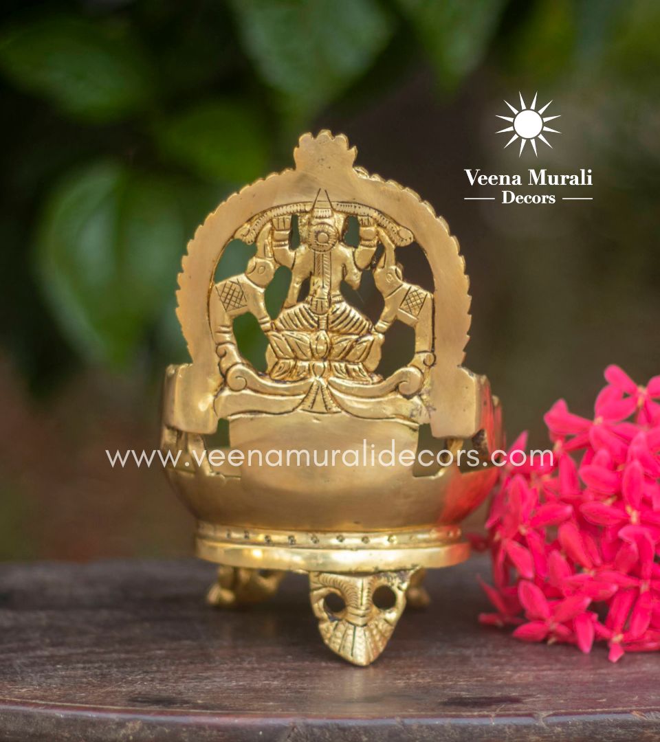 This Gajalakshmi brass lamp, intricately crafted in brass, symbolizes prosperity and grace, making it an ideal centerpiece for your pooja rituals or home decor.
