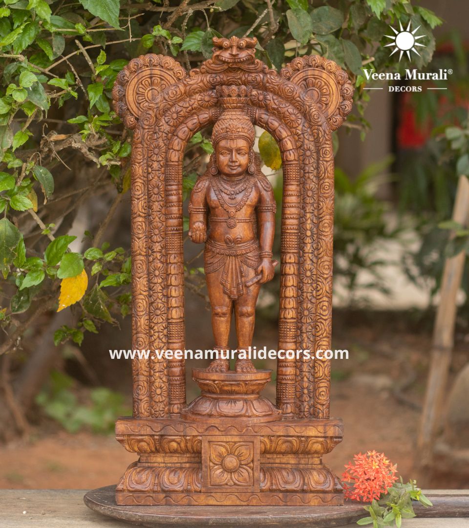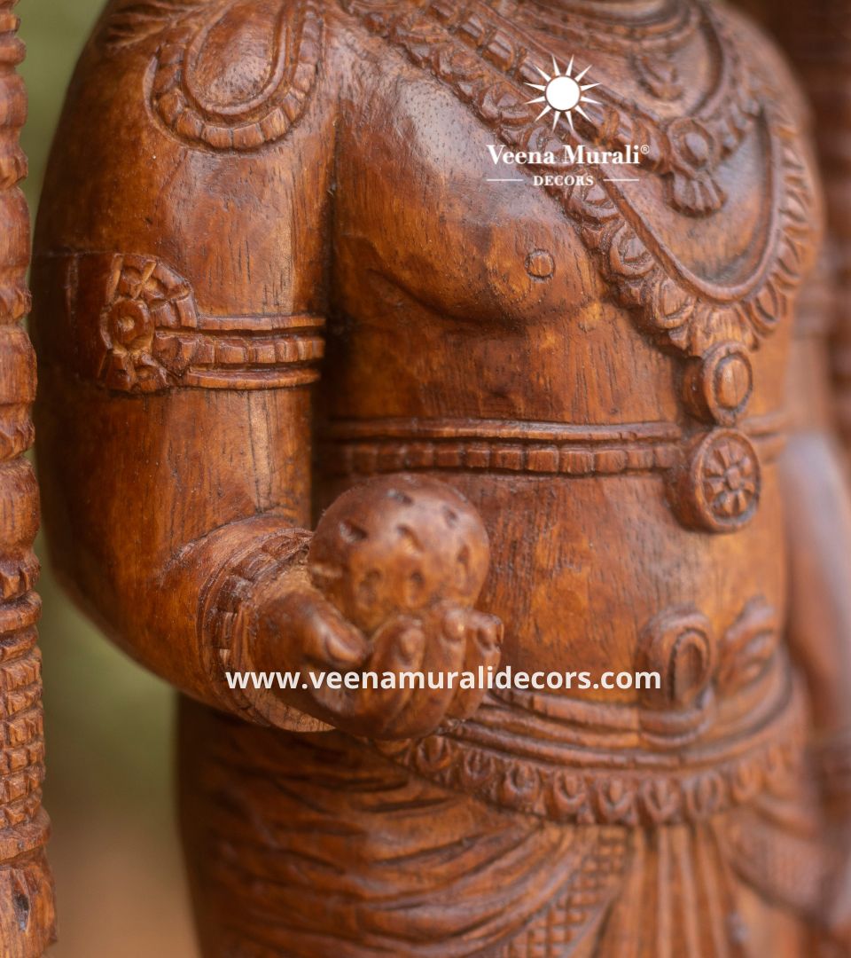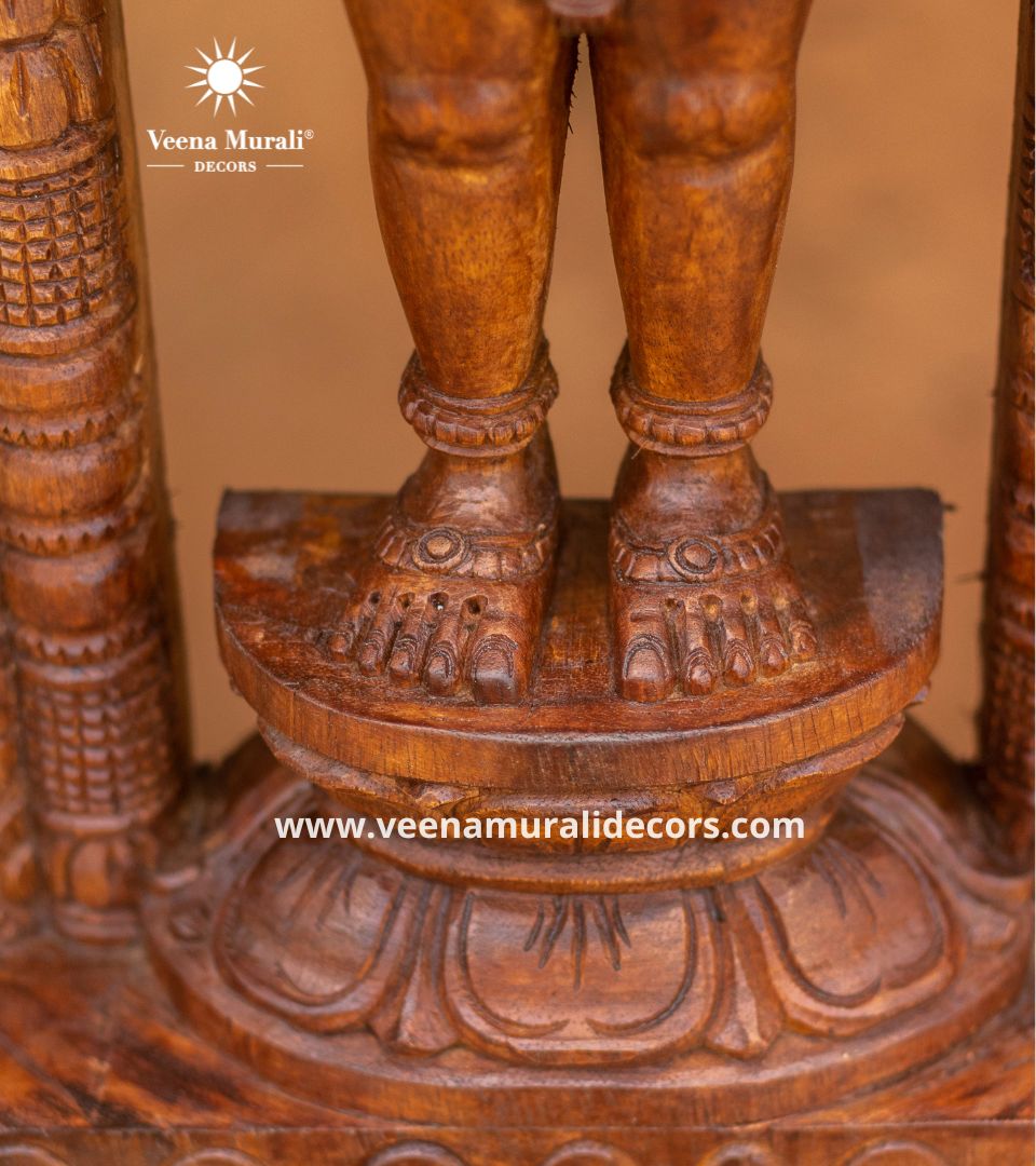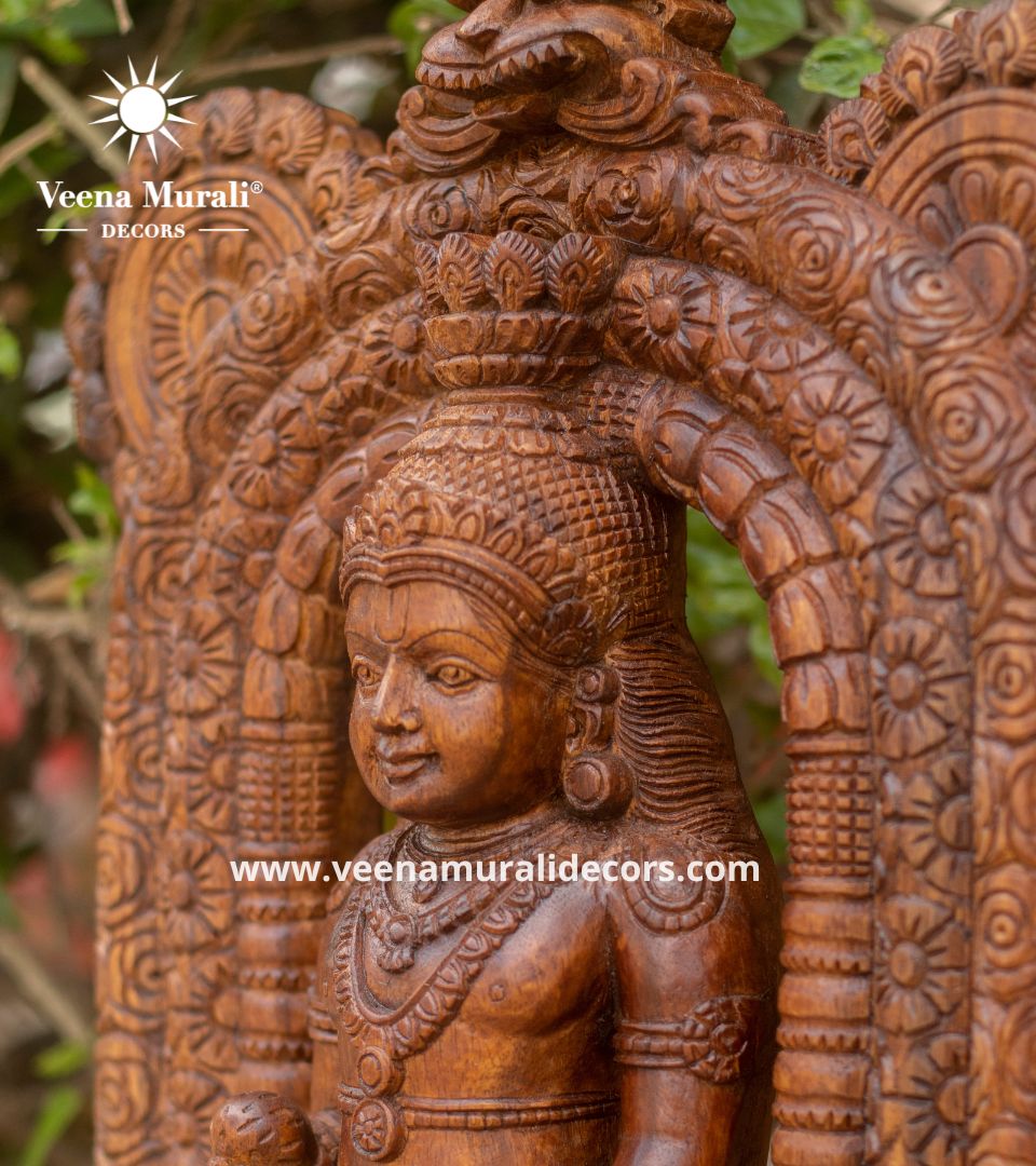 Small hand carved wooden Guruvayurappan, holding a flute and butter, standing with a gentle smile and surrounded by intricately carved flowers.