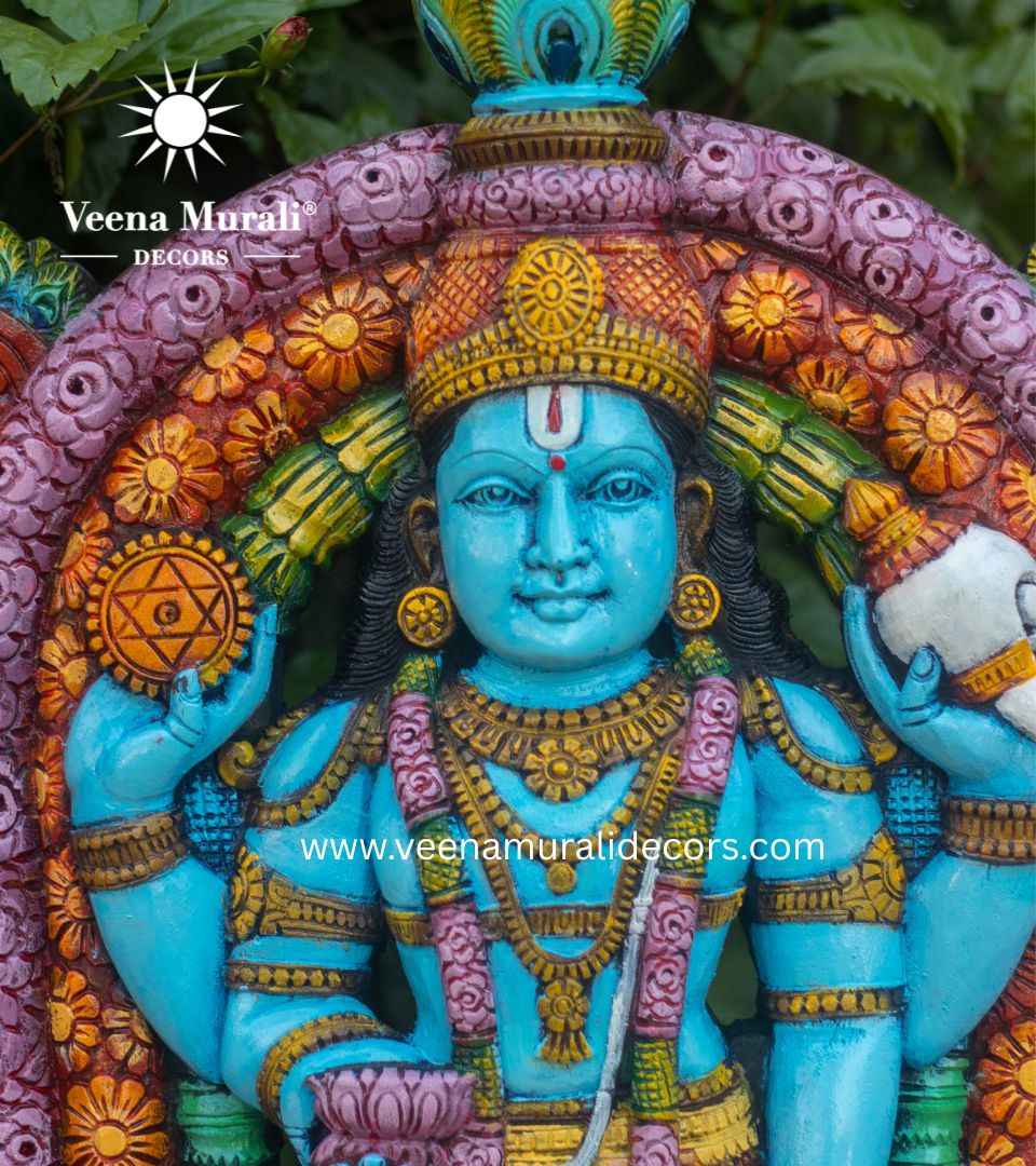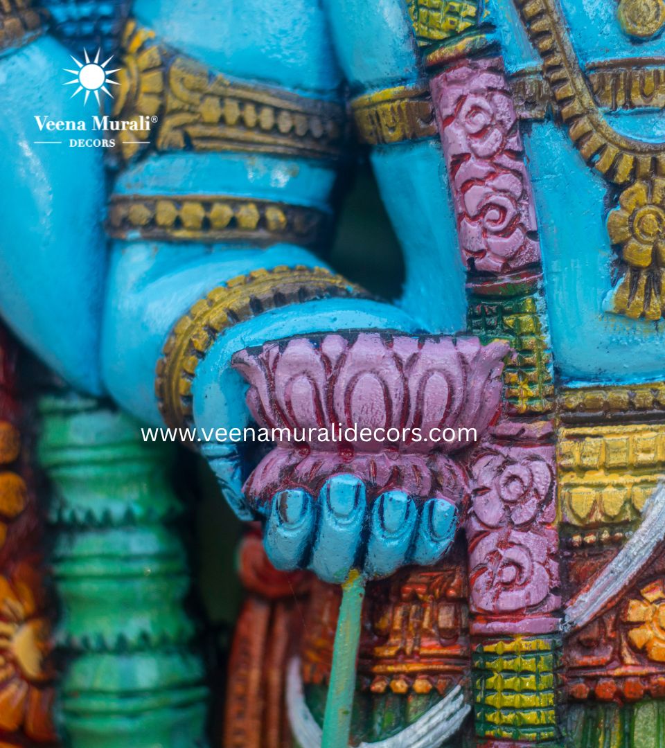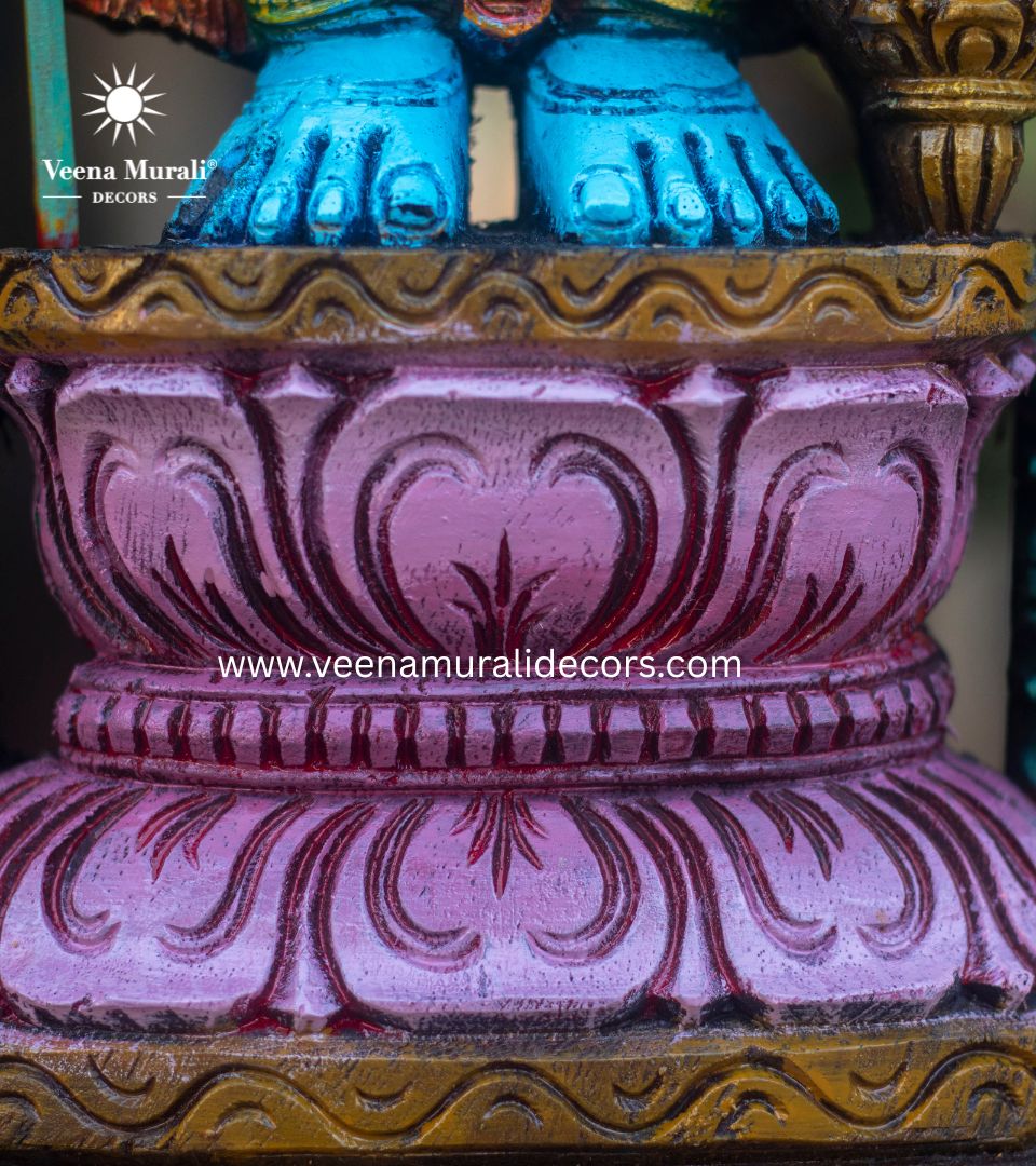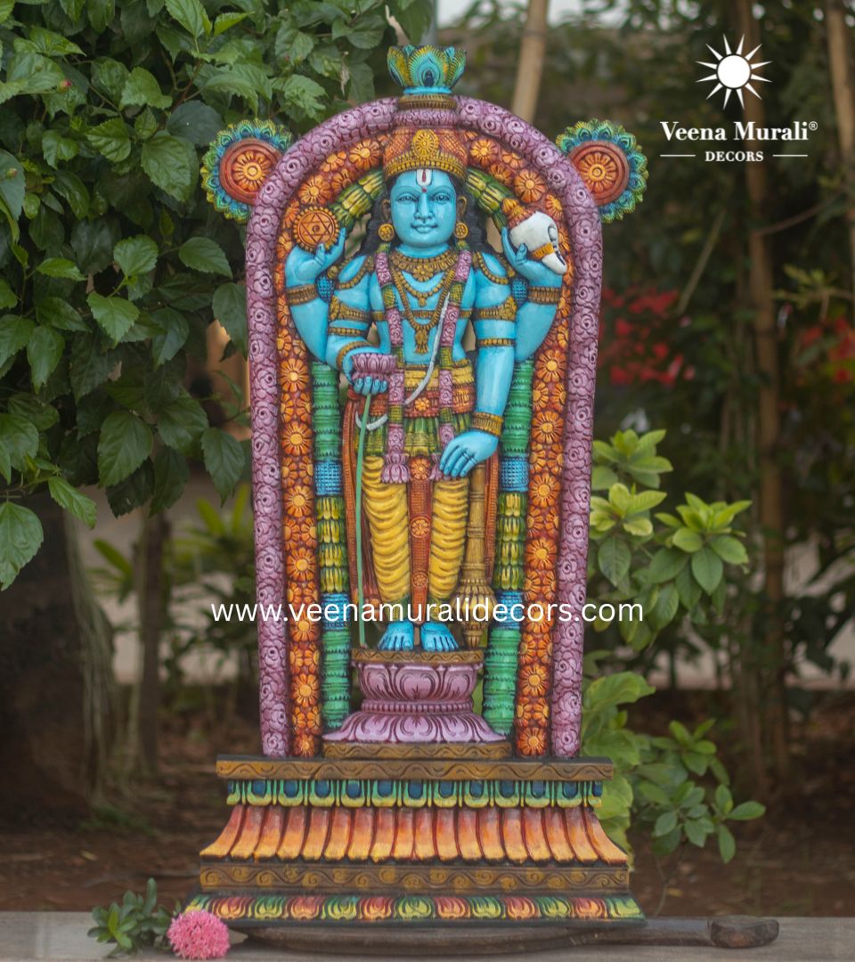 This 3-feet Vishnu MC idol is a masterpiece of traditional craftsmanship, carved with intricate details to embody divinity and elegance. Ideal for temple installations, pooja rooms, or heritageinspired home decor, this handcrafted wooden idol adds a sacred aura to any space. Its fine detailing highlights the rich artistry of Indian culture, making it both a spiritual and decorative centerpiece.