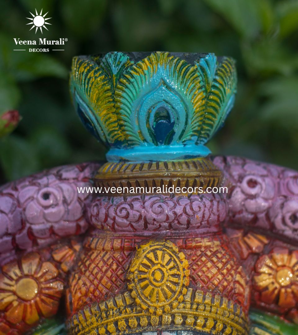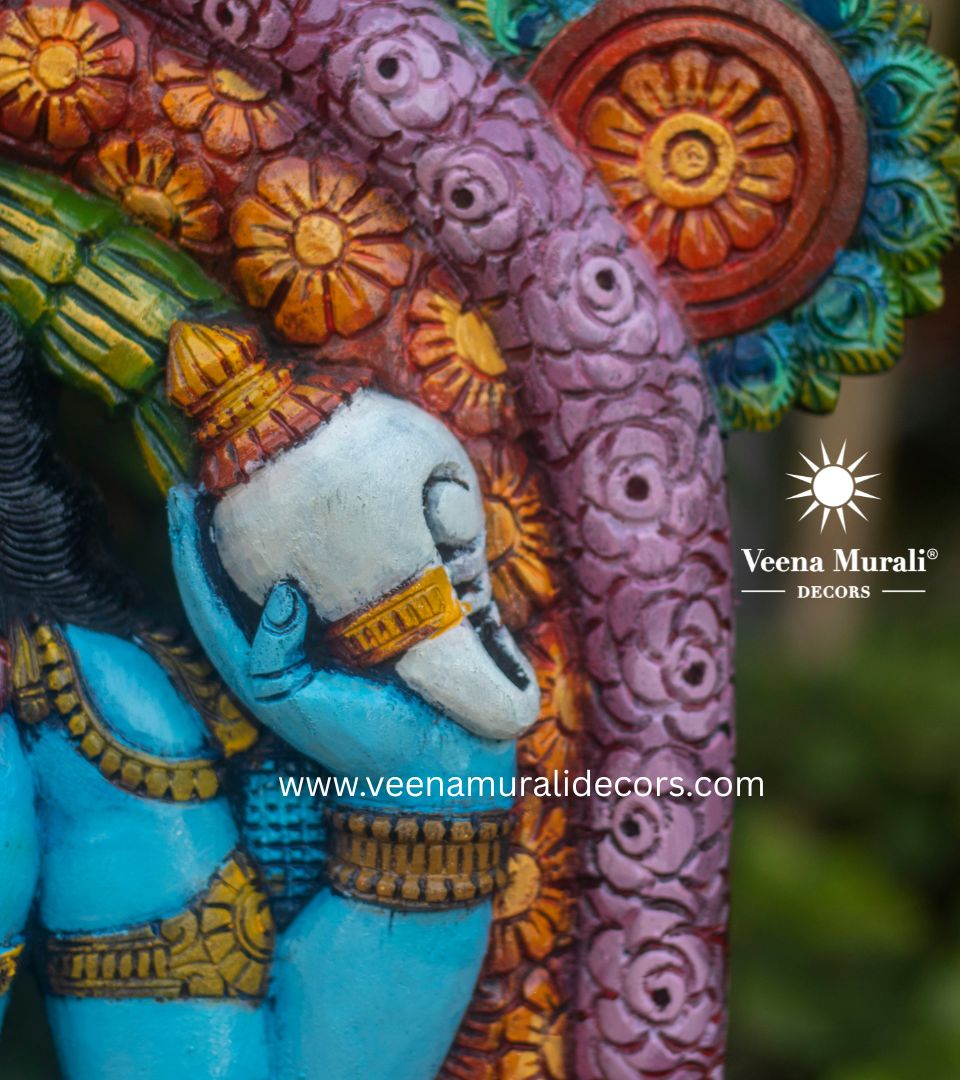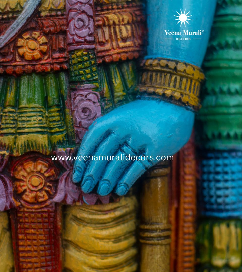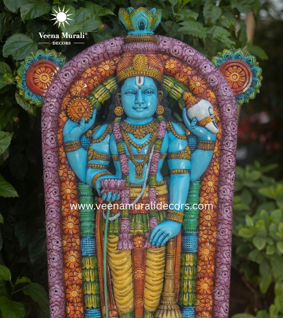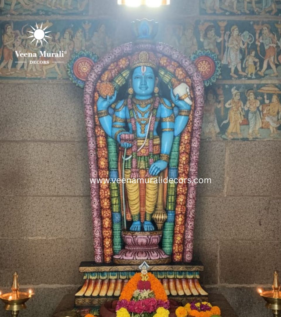 This 3-feet Vishnu MC idol is a masterpiece of traditional craftsmanship, carved with intricate details to embody divinity and elegance. Ideal for temple installations, pooja rooms, or heritageinspired home decor, this handcrafted wooden idol adds a sacred aura to any space. Its fine detailing highlights the rich artistry of Indian culture, making it both a spiritual and decorative centerpiece.