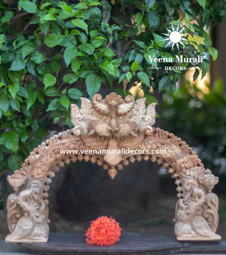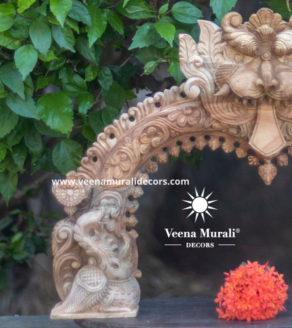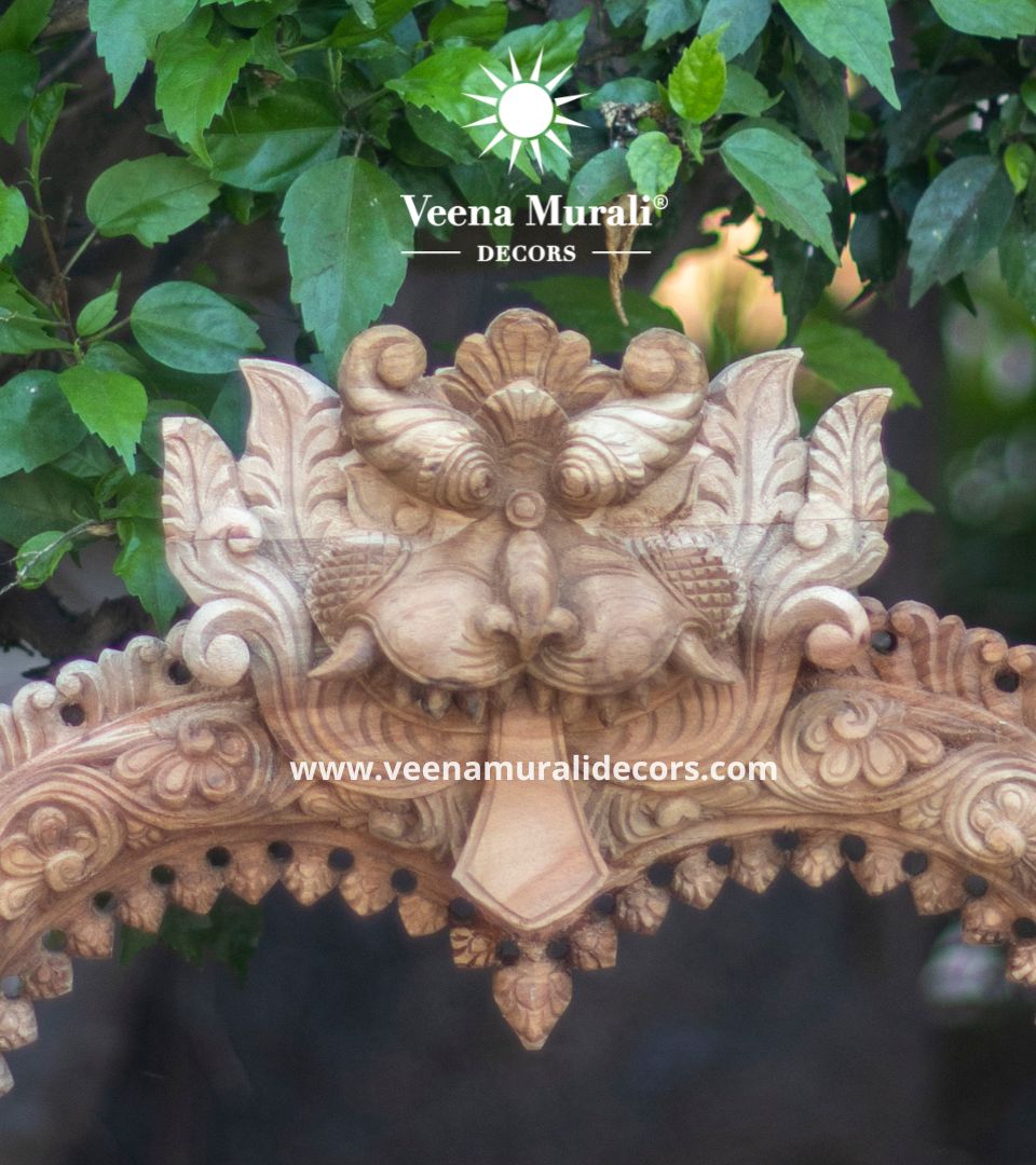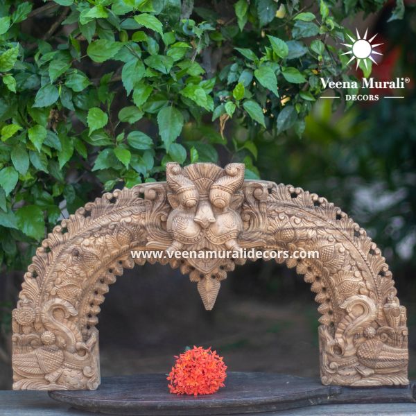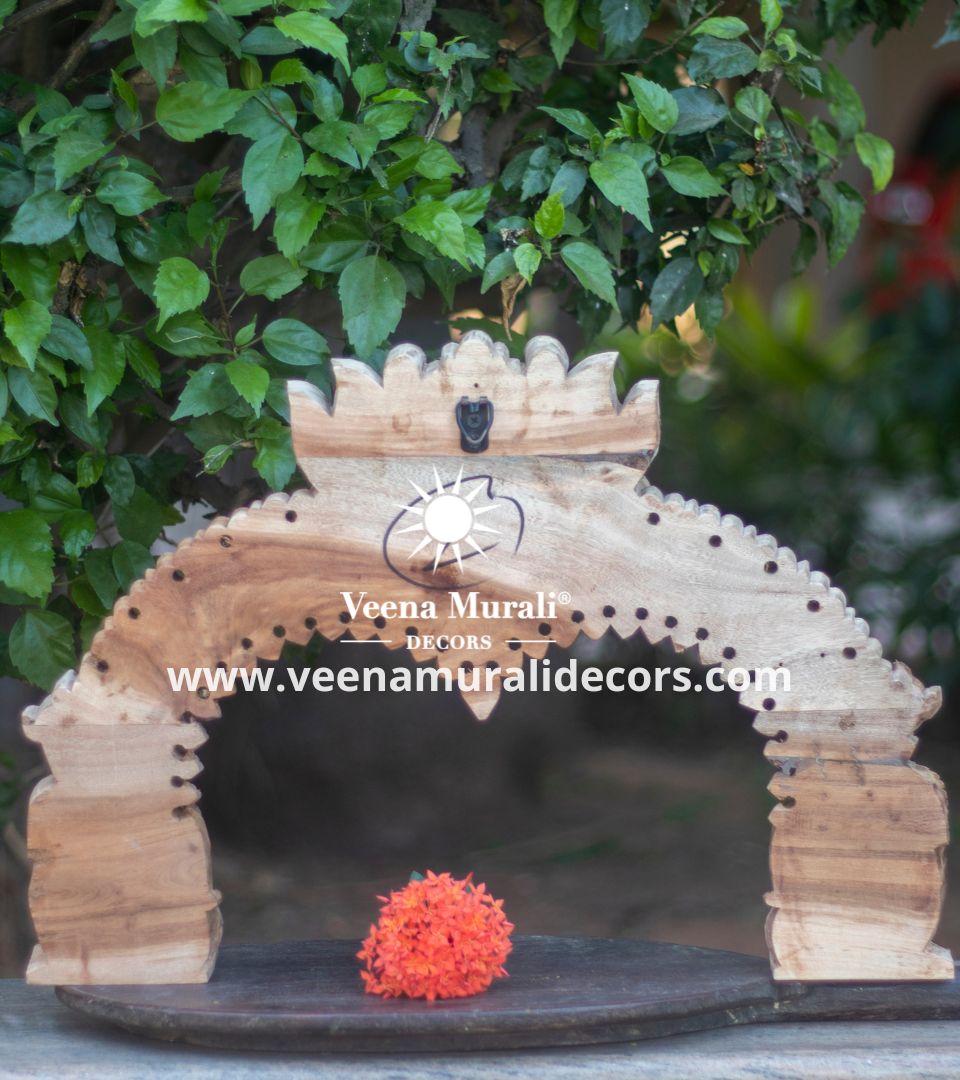 A Wooden Prabhavali Wall Hanging is a traditional decorative arch inspired by temple designs, crafted with intricate carvings. Perfect for pooja rooms or living spaces, it brings a spiritual and artistic charm to your home decor.